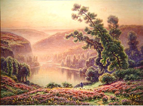 Peintre paysagiste et de marines, il fut l'élève de Baudit, Auguin et Lalanne à DIDIER-POUGET (William), 14/11/1874 Toulouse – 1959. Peintre paysagiste et de marines, il fut l'élève de Baudit, Auguin et Lalanne à Bx. Il se fit une réputation internationale avec ses paysages de brume ou de soleil couchant et ses tapis de bruyères en fleurs que Gaston Anglade imita ce qui lui valut un procès en copie de la part de Didier-Pouget. Dans un article de La Gironde du 16/??/1886 est signalé une toile exposée chez Duchemin (cours de l'Intendance), Marée montante au Cap Ferret, « ...tout ruisselant de lumière, tout imprégné pour ainsi dire de senteurs marines. ». Extrait de la notice du dictionnaire de Édouard-Joseph : « Peintre de la lumière, préoccupé de la l'atmosphère, de la transparence des brouillards, a su dégager la poésie des fougères et des bruyères....Il demeure un des maîtres reconnus du paysage français. ».Par contre Schurr et Cabanne sont plus sévères puisque, tout en reconnaissant une certaine poésie et sensibilité à ses oeuvres, ils parlent de « technique molle ». Expositions au SAF dès 1886 et dans plusieurs expositions universelles, il obtint une médaille en 1900 et une d'or en 1913. Parmi ses clients de l'époque, on peut noter le roi Georges 1er de Grèce, le musée Carnégie, l'ambassade à Saint-Petersbourg, le président Poincarré, la Ville de Paris. ![]() Bruyères en fleurs le matin, h/t.